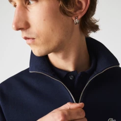 Available in several very now colours, this sweatshirt with a zippered stand-up collar is the new must-have for your urban style. The soft, ribbed cotton interlock fabric is topped off with a little green crocodile embroidered on the chest. Wear this stylish but casual basic with all your favourite t-shirts and polo shirts.