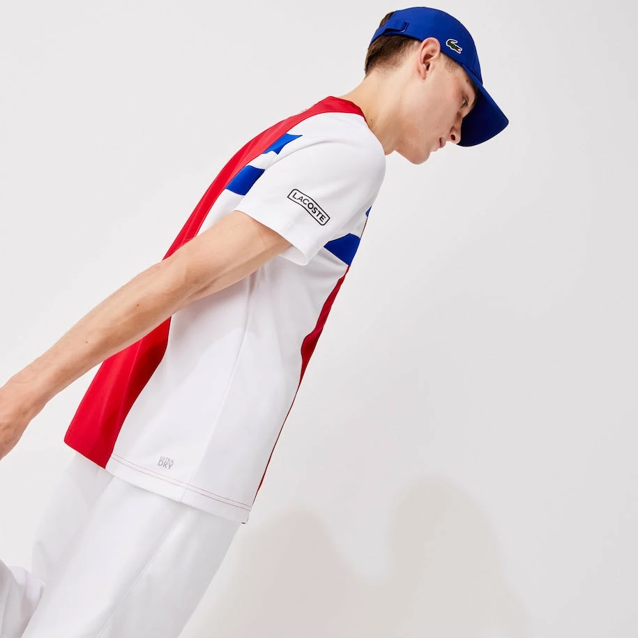 - Mix of mesh and run-resistant piqué panels on front, Lacoste lettering on right sleeve
