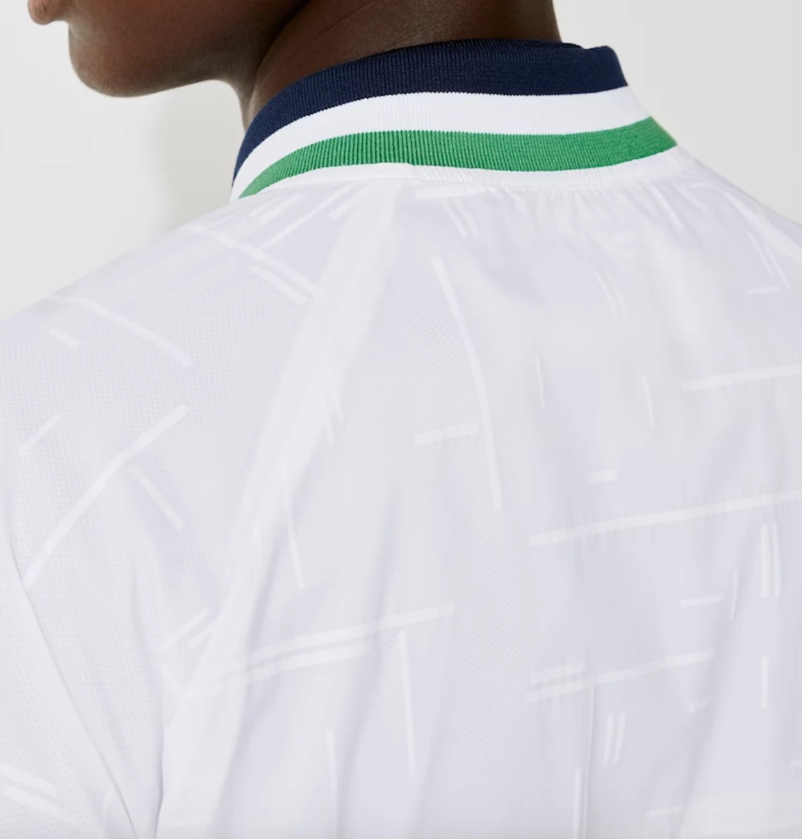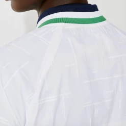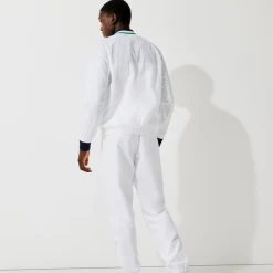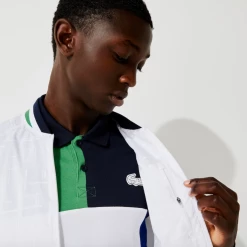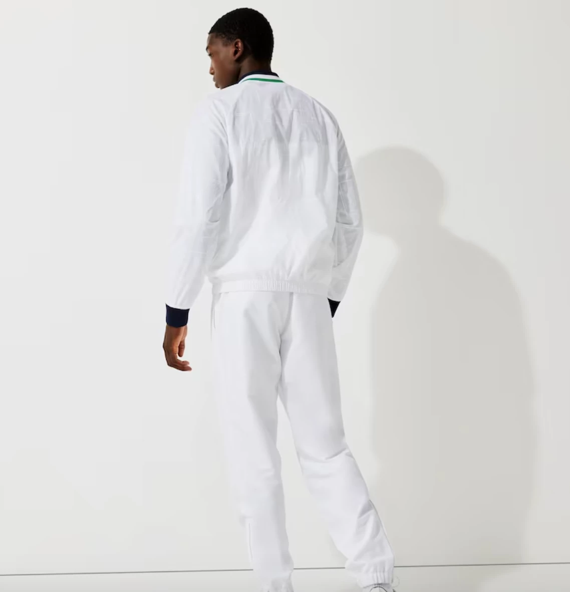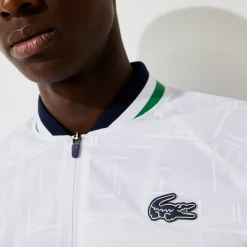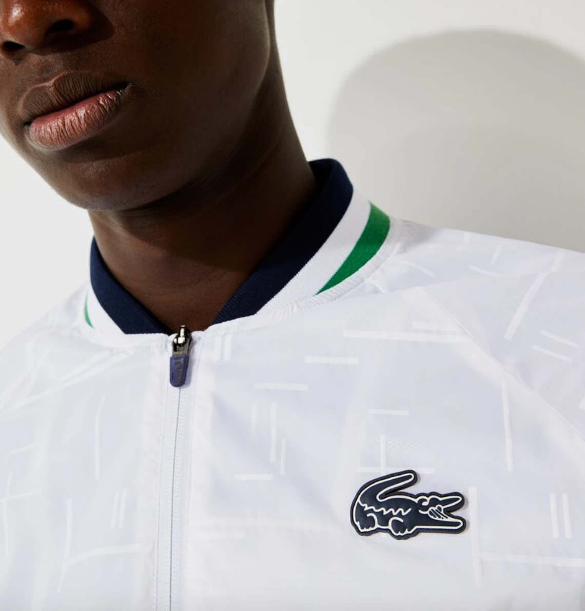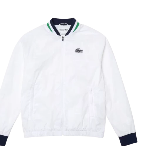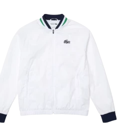 A lightweight water-resistant nylon, lined with breathable mesh, makes this Lacoste Sport teddy jacket irresistible. It is adorned with lines recalling the tennis court and it is equipped with an elasticised bottom, a neck in striped ribbing and contrasting cuffs. Made for training in any kind of weather.