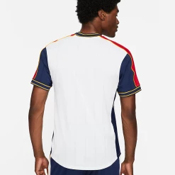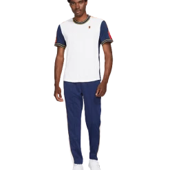 Striped ribbed fabric on the cuffs and collar, bold colour-blocking and a multi-coloured NikeCourt patch create a look that’s inspired by classic court apparel.